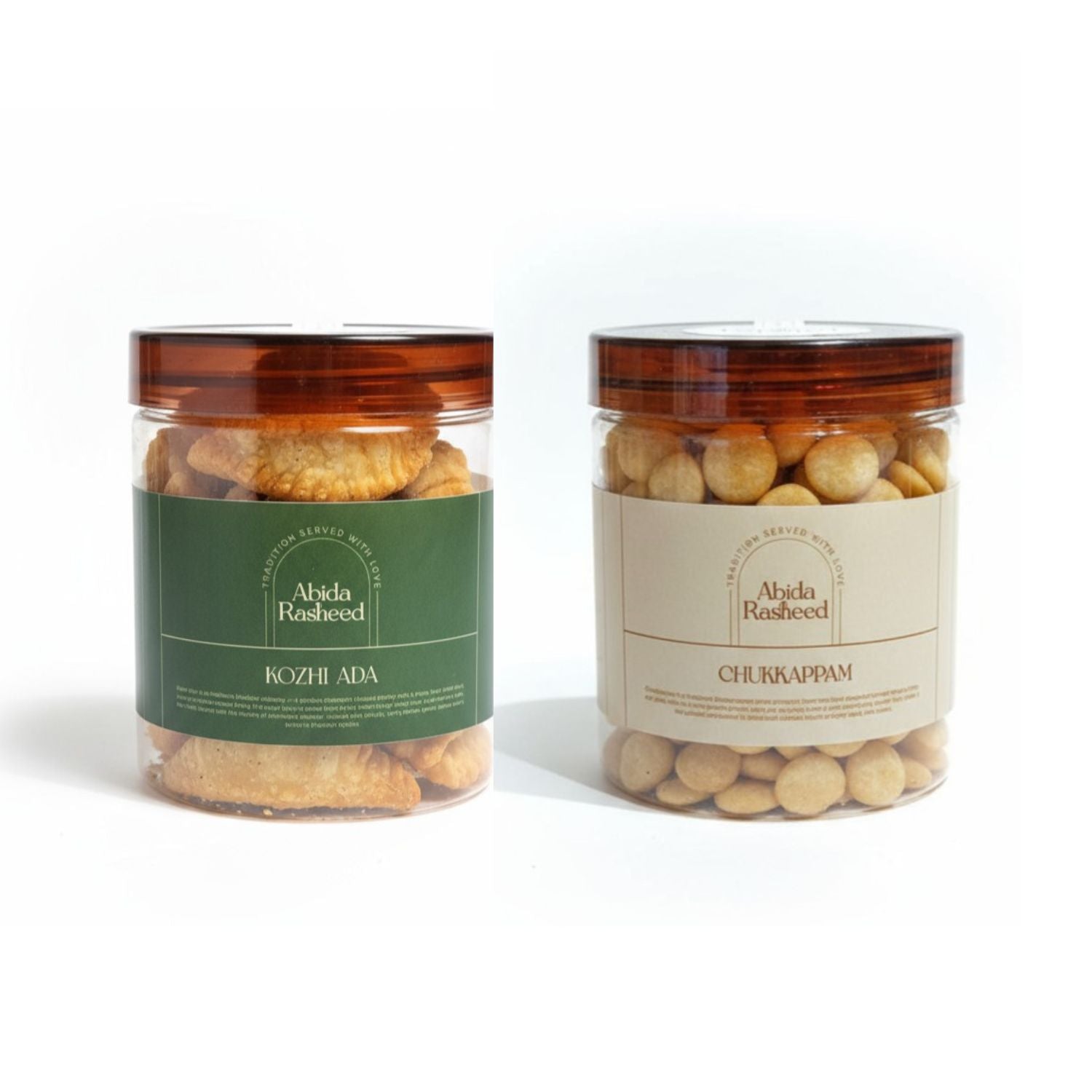 Experience the true taste of Malabar with this delightful combo of Chukkappam (250g) and Malabari Kozhi Ada, handcrafted in small batches by Abida Rasheed.
